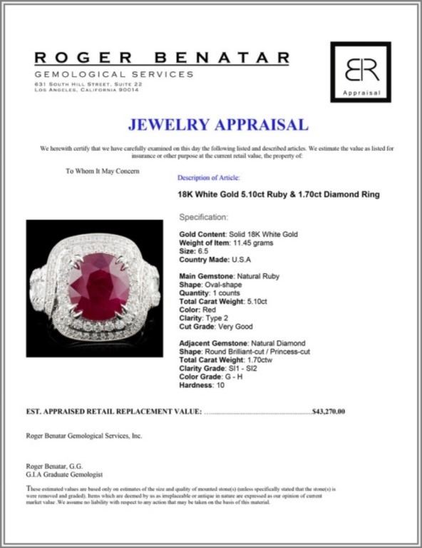 Estimated Retail Replacement Value: $43,270.00Ref: WAG17308Item no.: FA2054477023-BR6404ARSpecification:Gold Content: Solid 18K White Gold Weight of Item: 11.45 gramsSize: 6.5Country Made: U.S.A Main Gemstone: Natural Ruby Shape: Oval-shapeQuantity: 1 countsTotal Carat Weight: 5.10ctColor: RedClarity: Type 2Cut Grade: Very GoodAdjacent Gemstone: Natural Diamond Shape: Round Brilliant-cut / Princess-cutTotal Carat Weight: 1.70ctwClarity Grade: SI1 - SI2Color Grade: G - HHardness: 10 Great Condition - Shipping notes: We ship 4-10 Business day after the clearance of payment. Tracking numbers are emailed once the package(s) are shipped. Most shipments are sent by FEDEX Priority, UPS Priority, or US PRIORITY MAIL INSURED