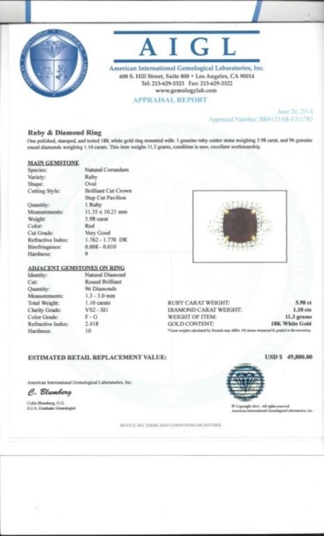 Regarding Appraised Jewelry and Loose Stones - Auctionfarm sends them out to a third party for Retail Replacement Value Appraisals, which are the most common. These types of evaluations are written for insurance needs. This would be the cost to replace the jewelry with an item of equal quality and kind, considered to be the current market price or the replacement value. This type of appraisal is done to protect you in the event of damage or loss of a valuable item. Our appraisals are conducted by independent 3rd Party appraisal firms that utilizes Certified GIA Gemologist. Appraisals should be used for verification of gemstone and/or metal weight, size, and grade only, not actual value. Appraisal value should be considered for insurance purposes only, not actual value, as price varies greatly from retail locations thru out the world. Items should not be purchased with the expectation to resell for appraisal price, or for profit.
