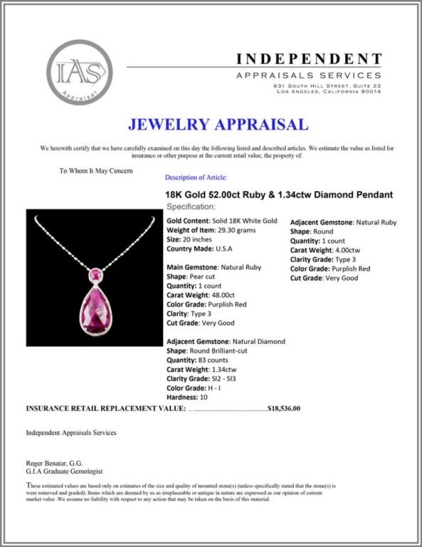 18K Gold 52.00ct Ruby & 1.34ctw Diamond Pendant
