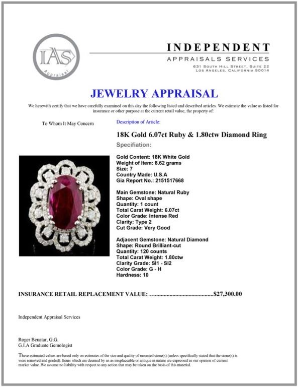 18K Gold 6.07ct Ruby & 1.80ctw Diamond Ring
