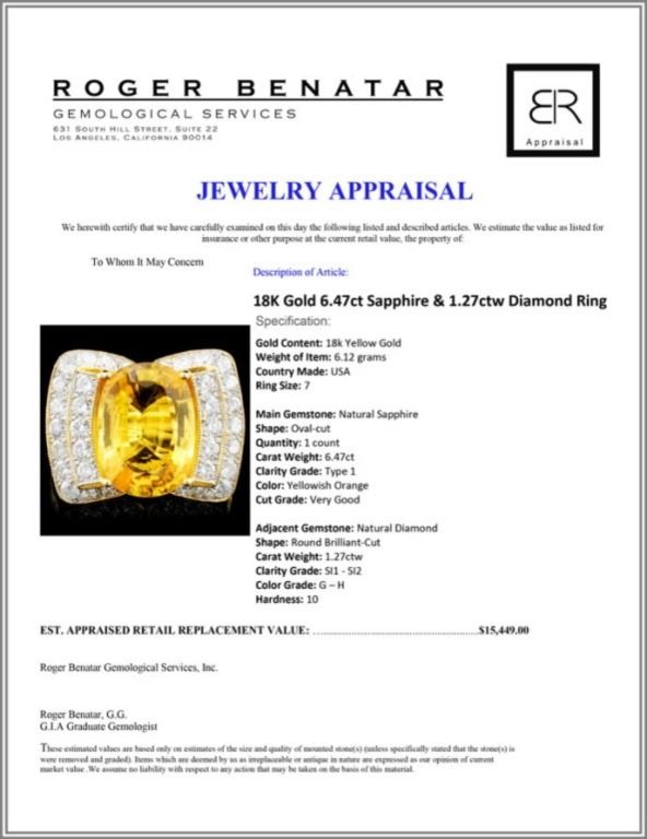 Regarding Appraised Jewelry and Loose Stones - Auctionfarm sends them out to a third party for Retail Replacement Value Appraisals, which are the most common. These types of evaluations are written for insurance needs. This would be the cost to replace the jewelry with an item of equal quality and kind, considered to be the current market price or the replacement value. This type of appraisal is done to protect you in the event of damage or loss of a valuable item. Our appraisals are conducted by independent 3rd Party appraisal firms that utilizes Certified GIA Gemologist. Appraisals should be used for verification of gemstone and/or metal weight, size, and grade only, not actual value. Appraisal value should be considered for insurance purposes only, not actual value, as price varies greatly from retail locations thru out the world. Items should not be purchased with the expectation to resell for appraisal price, or for profit.