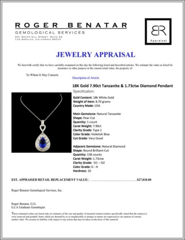 Regarding Appraised Jewelry and Loose Stones - Auctionfarm sends them out to a third party for Retail Replacement Value Appraisals, which are the most common. These types of evaluations are written for insurance needs. This would be the cost to replace the jewelry with an item of equal quality and kind, considered to be the current market price or the replacement value. This type of appraisal is done to protect you in the event of damage or loss of a valuable item. Our appraisals are conducted by independent 3rd Party appraisal firms that utilizes Certified GIA Gemologist. Appraisals should be used for verification of gemstone and/or metal weight, size, and grade only, not actual value. Appraisal value should be considered for insurance purposes only, not actual value, as price varies greatly from retail locations thru out the world. Items should not be purchased with the expectation to resell for appraisal price, or for profit.