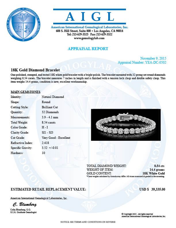 Retail: $39,335.00 ****** 18K Gold 8.54ct Diamond Bracelet ****** Metal: 18K Solid Gold / Total Item Weight: 14.4 grams / Country Made: United States / / Main Stone: Diamond / Carat Total Weight: 8.54 / Treatment: None / Cut: Very Good - Excellent / Color Grade: H - I / Clarity: SI1 - SI3 / Cut: Round Brilliant /