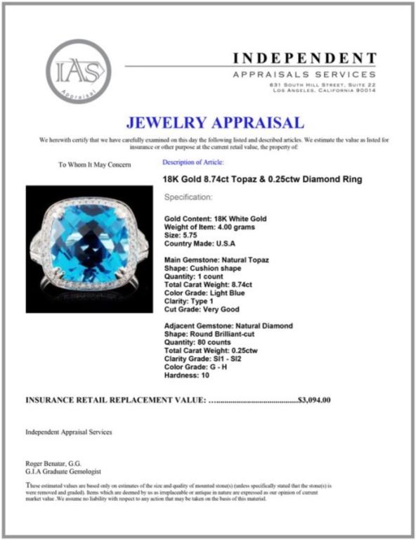 Regarding Appraised Jewelry and Loose Stones - Auctionfarm sends them out to a third party for Retail Replacement Value Appraisals, which are the most common. These types of evaluations are written for insurance needs. This would be the cost to replace the jewelry with an item of equal quality and kind, considered to be the current market price or the replacement value. This type of appraisal is done to protect you in the event of damage or loss of a valuable item. Our appraisals are conducted by independent 3rd Party appraisal firms that utilizes Certified GIA Gemologist. Appraisals should be used for verification of gemstone and/or metal weight, size, and grade only, not actual value. Appraisal value should be considered for insurance purposes only, not actual value, as price varies greatly from retail locations thru out the world. Items should not be purchased with the expectation to resell for appraisal price, or for profit.