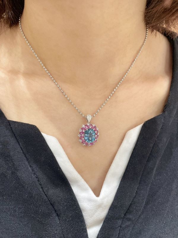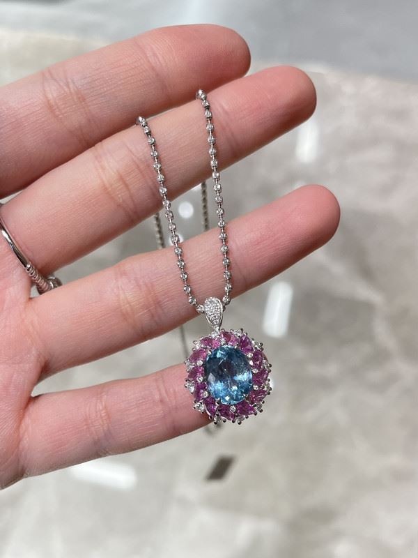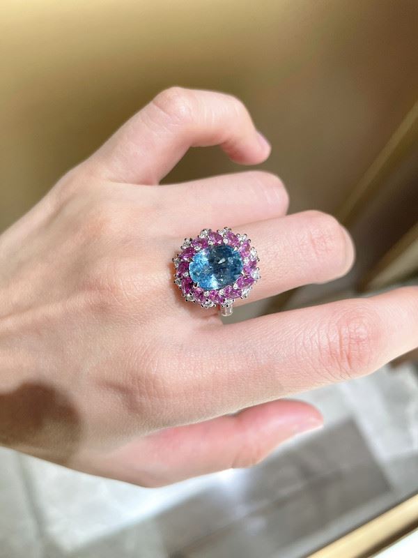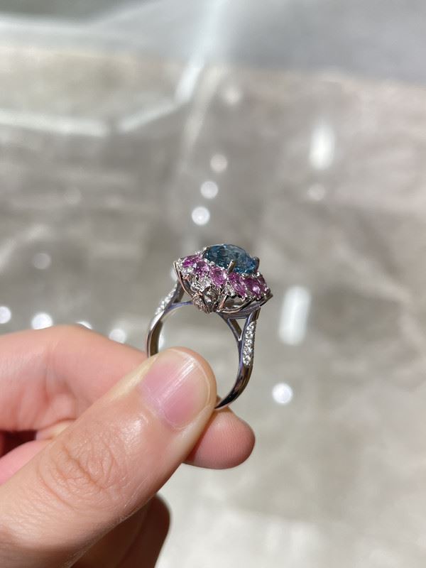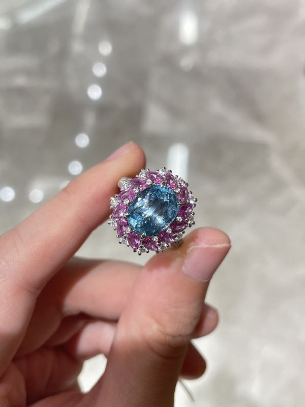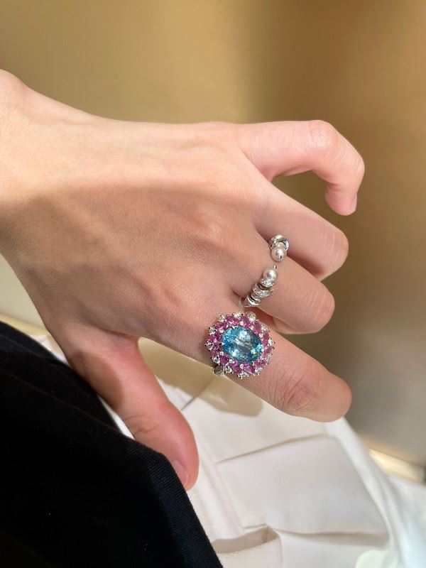 This 18K gold ring features a dazzling aquamarine at its center, surrounded by pink sapphires and diamonds, resembling a radiant treasure from the ocean. The vibrant gemstones and intricate design blend perfectly, exuding luxury and modern flair, showcasing the wearer’s noble character and exceptional taste.Ring size: 6, circumference: 52 mm, diameter: 16.6 mm, total weight: 7.19g.Note: GUILD certificate, comes with a jewelry, gemstone, and precious metal authentication certificate.