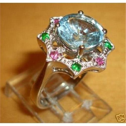<P>Up for auction is this gorgeous ladies aquamarine, ruby and emerald ring. This ring is centered with one genuine round Aquamarine. This Aquamarine is a beautiful aqua blue color, measures 9 mm in diameter and weighs 3.48 carats. There are four genuine round Emeralds and four natural round Rubies set in this ring. These gemstones weigh a total of 1/3 carat. This ring is solid 18KT White Gold and is a finger size 7, which can easily be resized. The ring weighs 6.1 grams. This ring is brand new and will also be accompanied by an appraisal by a GIA Certified Diamond Grader with the replacement value of $1,829.00. I will ship this ring promptly in a beautiful gift box. Good Luck with my great deals.</P>
