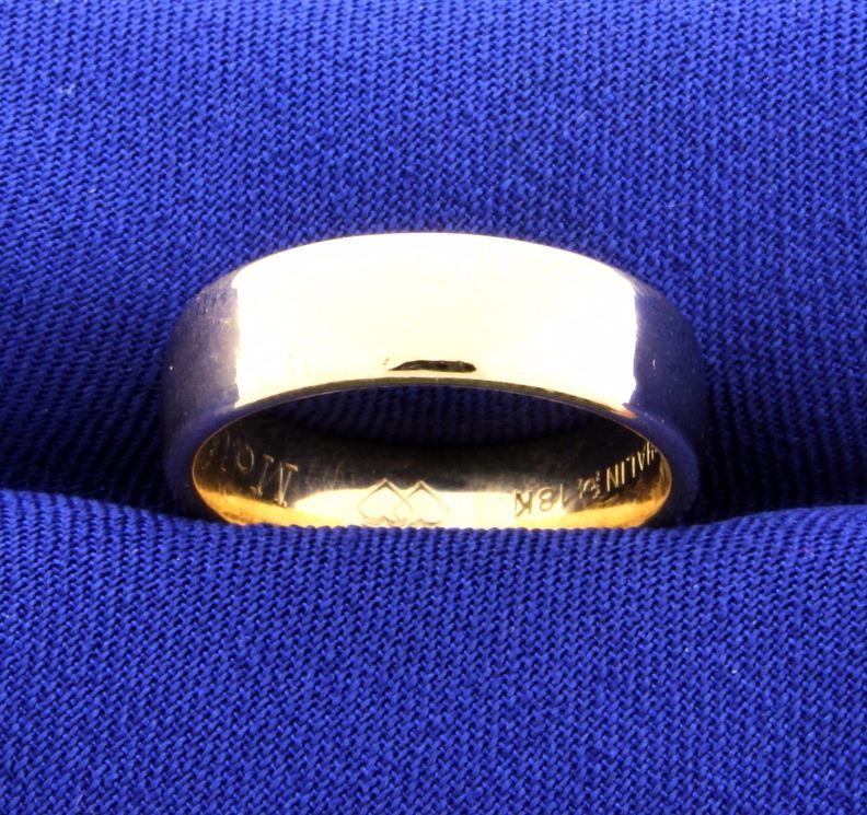 In 18K yellow gold, it has "Malin 20/7 2006" engraved on the inside of shank. The band is 5.9mm wide and is a size 7 1/4. 7.8g