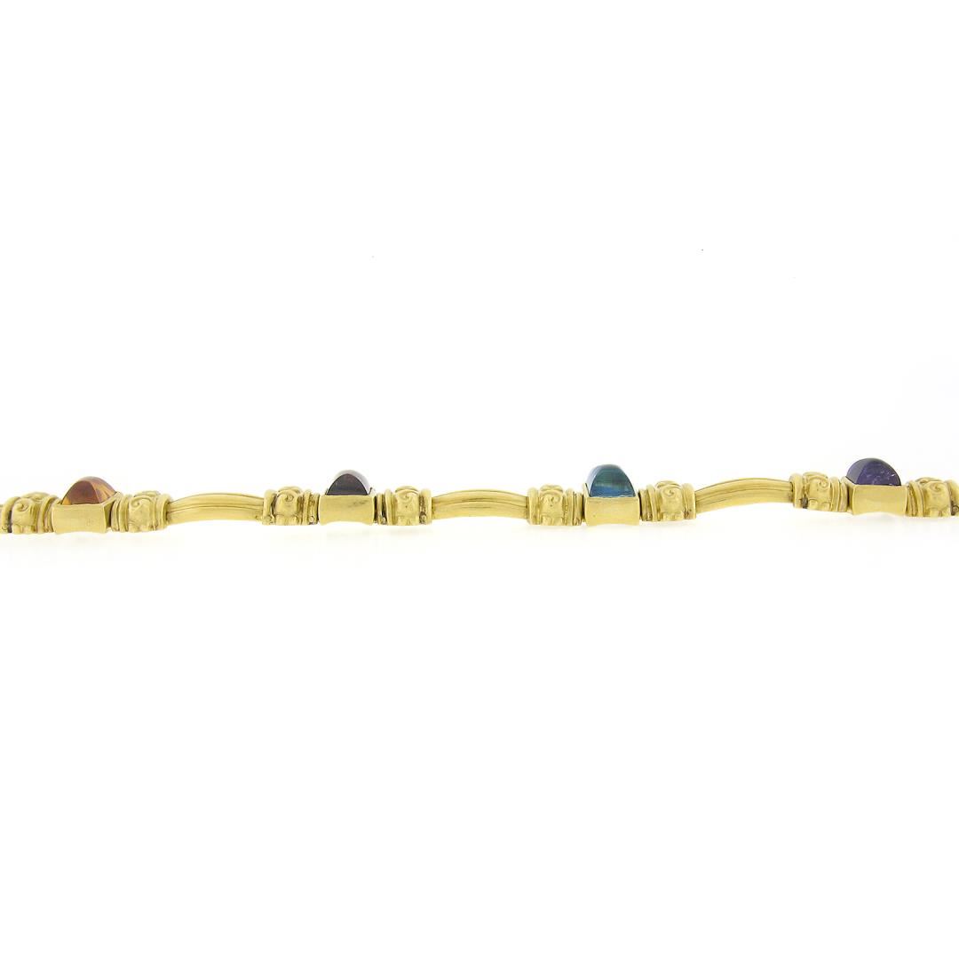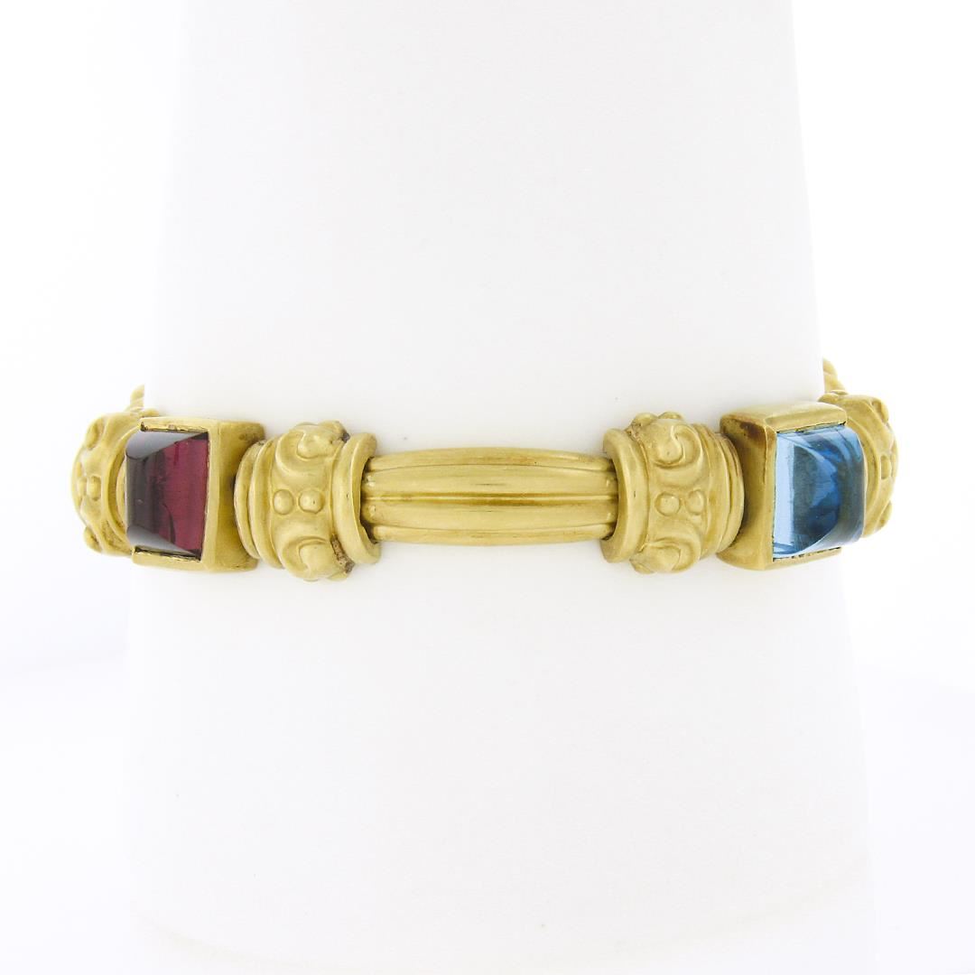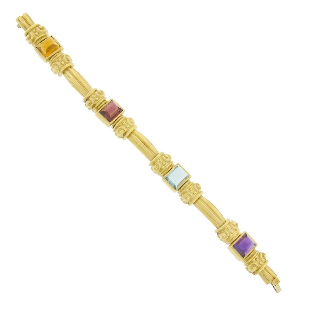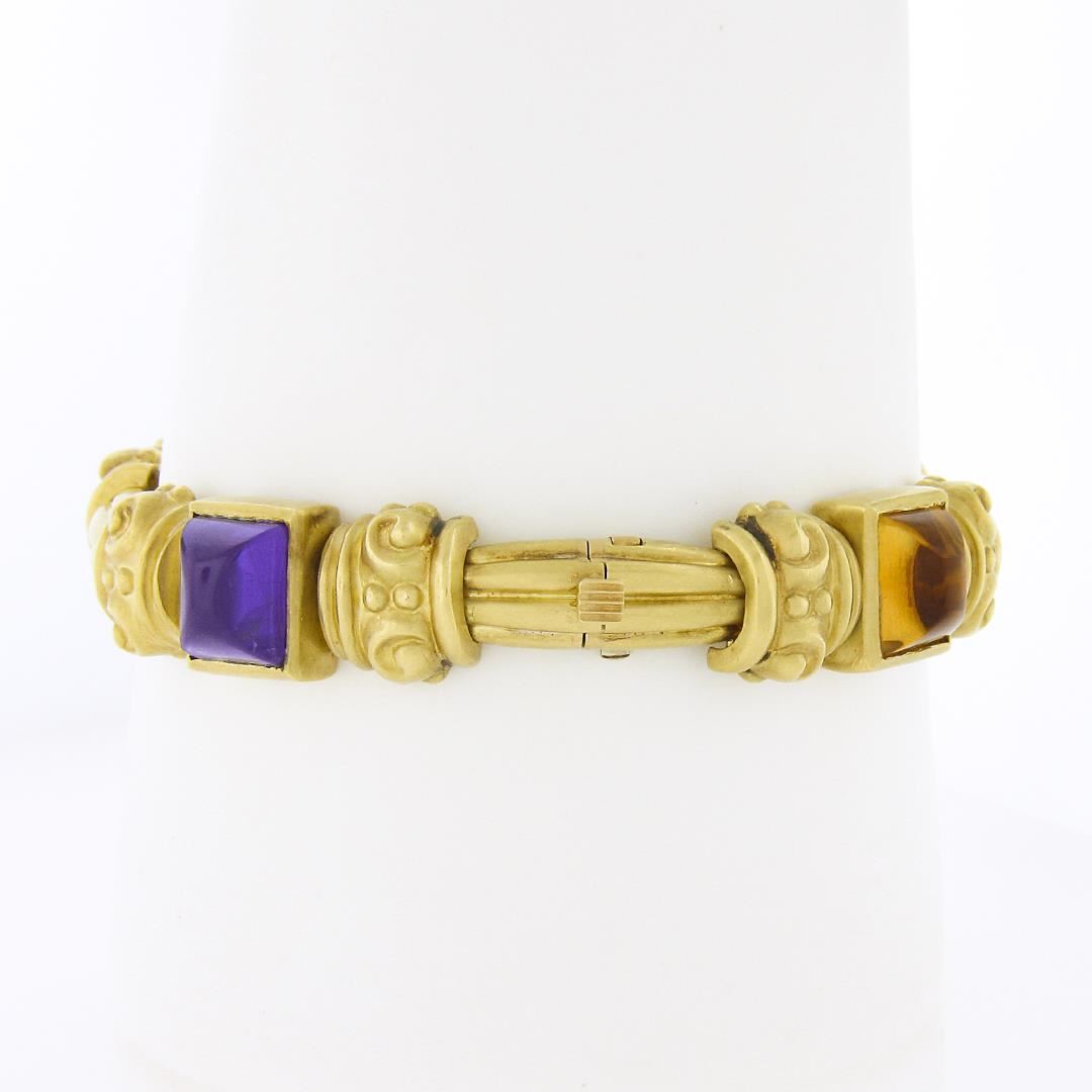 A solid 18k yellow gold bracelet, with 4 rectangular cabochon cut natural amethyst, topaz, garnet & citrine (9.4x7.5mm each). It weighs a total of 47.26 grams, measures 12.5mm wide, and measures 7 inches in length.