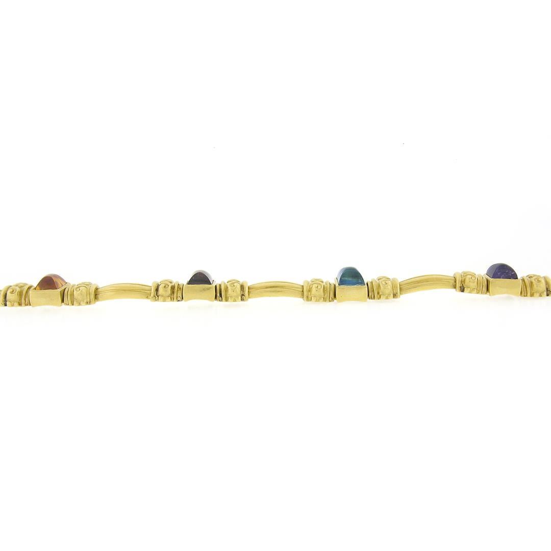 18K Gold & Bezel Set Multi Color Cabochon Gemstone Scroll Grooved Link Bracelet