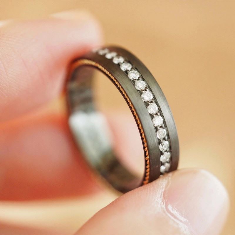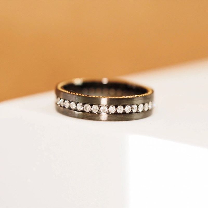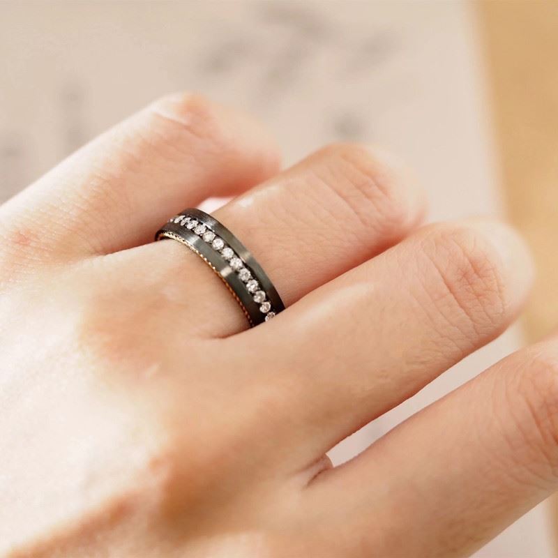 This 18K gold black gold diamond ring features a unique design with a black metal band, complemented by a row of sparkling diamonds at the center, and elegant gold edging that adds luxury and modern flair. The perfect contrast between the black and gold highlights the ring's stylish charm, making it ideal for various occasions and showcasing the wearer’s unique taste and personality.Ring size: 6, circumference: 52 mm, diameter: 16.6 mm, total weight: 5.65g.Note: GUILD certificate, comes with a jewelry, gemstone, and precious metal authentication certificate.