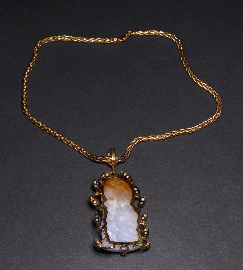18K Gold, Carved Jadeite & Diamond Pendant & Necklace by Victor Loo containing twenty-seven round cut brilliant diamonds weighing approximately 1.60 cts Total weight of 55.6 gm. Estimated retail value $7,800.