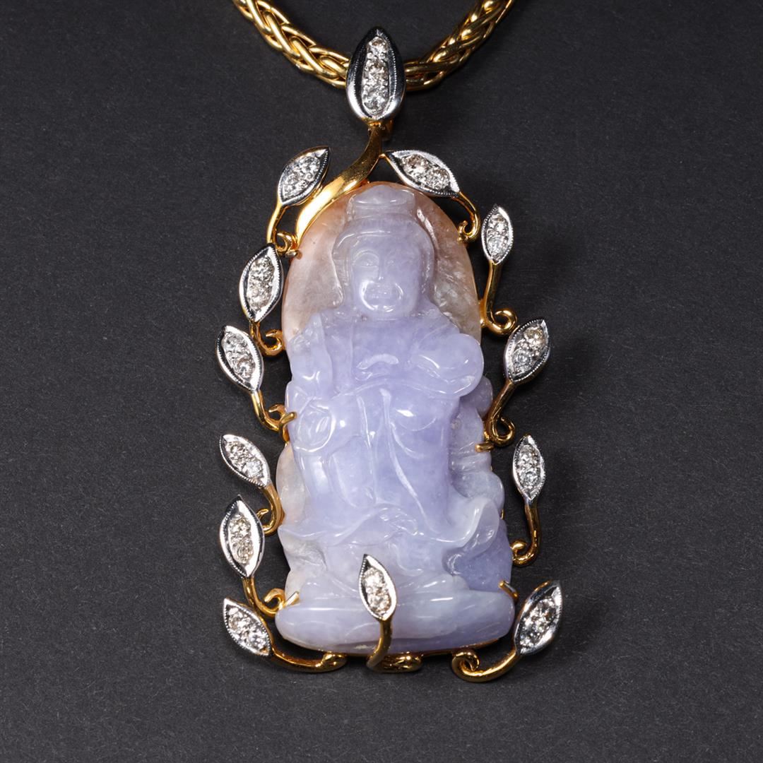 18K Gold, Carved Jadeite & Diamond Pendant & Necklace by Victor Loo containing twenty-seven round cut brilliant diamonds weighing approximately 1.60 cts Total weight of 55.6 gm. Estimated retail value $7,800.