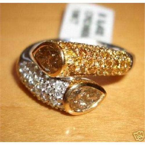 <P>Up for auction is this gorgeous ladies diamond bypass ring. This ring is set with two genuine Pear Shaped Cognac color Diamonds. These diamonds are a beautiful brilliant cognac color, SI2 clarity and weigh a total of .80 carat. There are thirty-five genuine White round brilliant diamonds and thirty-five natural Cognac Round Brilliant Diamonds pave-set in this ring in a bypass design. These diamonds are G color, SI in clarity and weigh a total of 1.05 carats. The total diamond weight of this ring is 1.85 carats. This ring is solid 18KT Yellow and White Gold, and is a finger size 6 3/4, which can be easily resized. The ring weighs 6.2 grams and is brand new. This ring will also be accompanied by an appraisal by a GIA Certified Diamond Grader with the replacement value of $4,329.00. I will ship this ring promptly in a beautiful gift box. Good Luck with my great deals.</P>