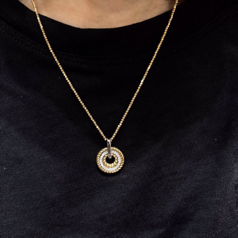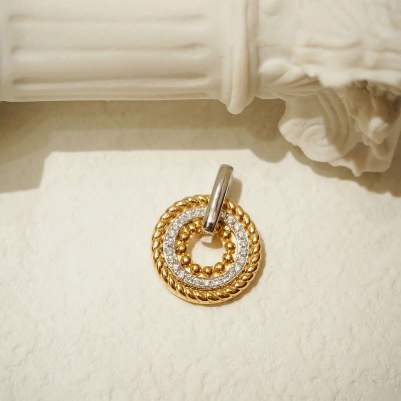 This 18K gold pendant features a dual-circle design with a beaded gold outer ring and a diamond-set inner circle. The interplay of gold and sparkle captures a timeless sense of harmony and refined elegance.Total weight: 5.12g.Note: GUILD certificate, comes with a jewelry, gemstone, and precious metal authentication certificate.