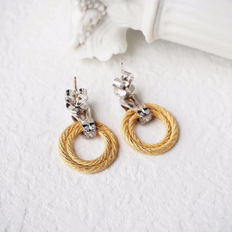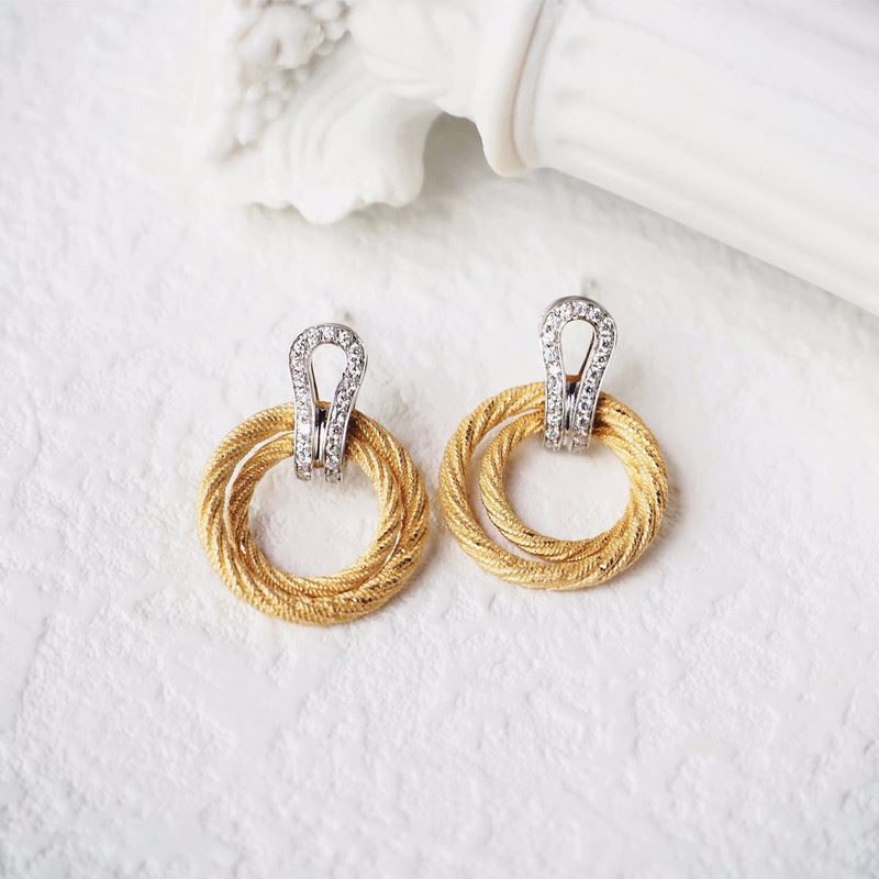 These 18K gold diamond earrings feature an exquisite double-ring design, where the golden ropes are adorned with diamonds, creating a unique aesthetic that blends luxury and modernity. The design is simple yet elegant, suitable for various occasions, showcasing the wearer's refined taste and noble aura.Total weight: 7.06g.Note: GUILD certificate, comes with a jewelry, gemstone, and precious metal authentication certificate.