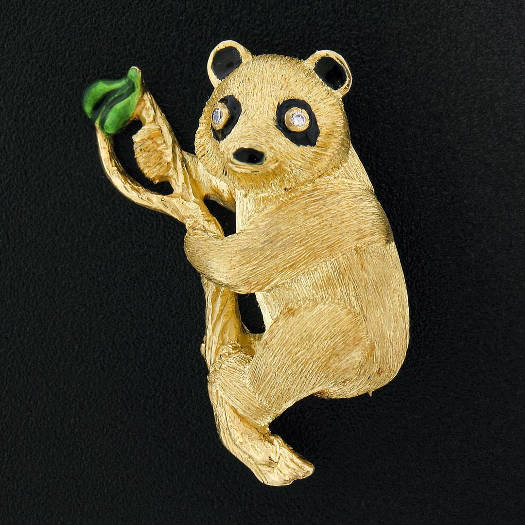 A solid 18k yellow gold and enamel work panda brooch. with 2 round brilliant cut natural diamonds (G - VS2 ; 0.05ct). Measures 35.50x21.70mm and weighs a total of 13.79 grams.
