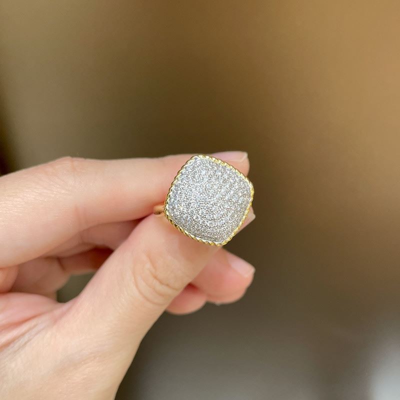 This 18K gold diamond pave ring features a stunning design with the ring face fully paved with sparkling diamonds, creating a dazzling and luxurious appearance. The twisted band adds an extra touch of refinement. Perfect for both everyday wear and special occasions, this ring enhances the wearer’s elegance and allure.Total weight: 6.88g.Note: GUILD certificate, comes with a jewelry, gemstone, and precious metal authentication certificate.