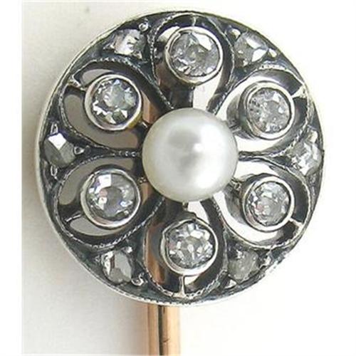 <p> </p> <p> Stunning Victorian pin made in sterling over 18K yellow gold (acid tested) pin with six European cut diamonds TCW 18 points in H/I color VS1 clarity set into a pierced scrolling floral design with a salt water cultured pearl in the center. This pin?s head measures 11.34 mm in diameter (a bit short of 1/2?) and the pin itself is 2 7/8? long. Great collector?s piece, exceptional quality, a must get!!</p> <p>
