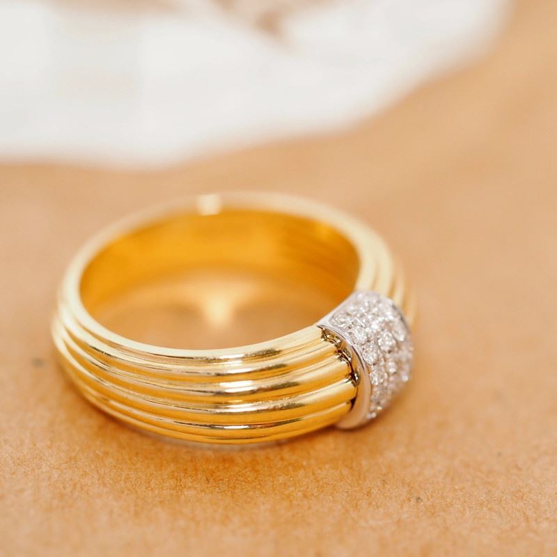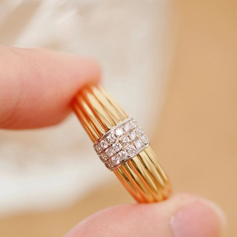 This 18K gold diamond striped ring features a sleek and elegant design with fine linear detailing along the band, accented by a cluster of sparkling diamonds at the center. The perfect blend of gold and diamonds creates a refined, modern look. Ideal for both everyday wear and formal occasions, this ring adds a touch of sophistication and brilliance to any style.Ring size: 6, circumference: 53 mm, diameter: 17 mm, total weight: 6.5g.Note: GUILD certificate, comes with a jewelry, gemstone, and precious metal authentication certificate.