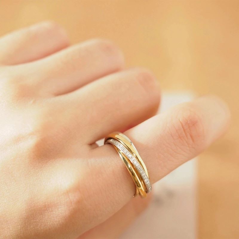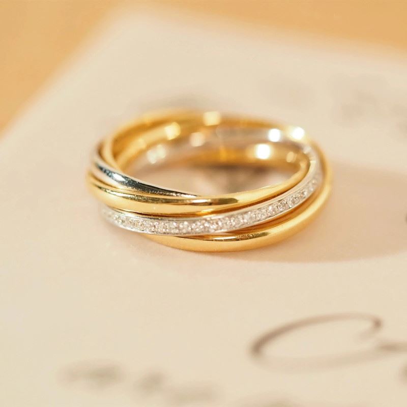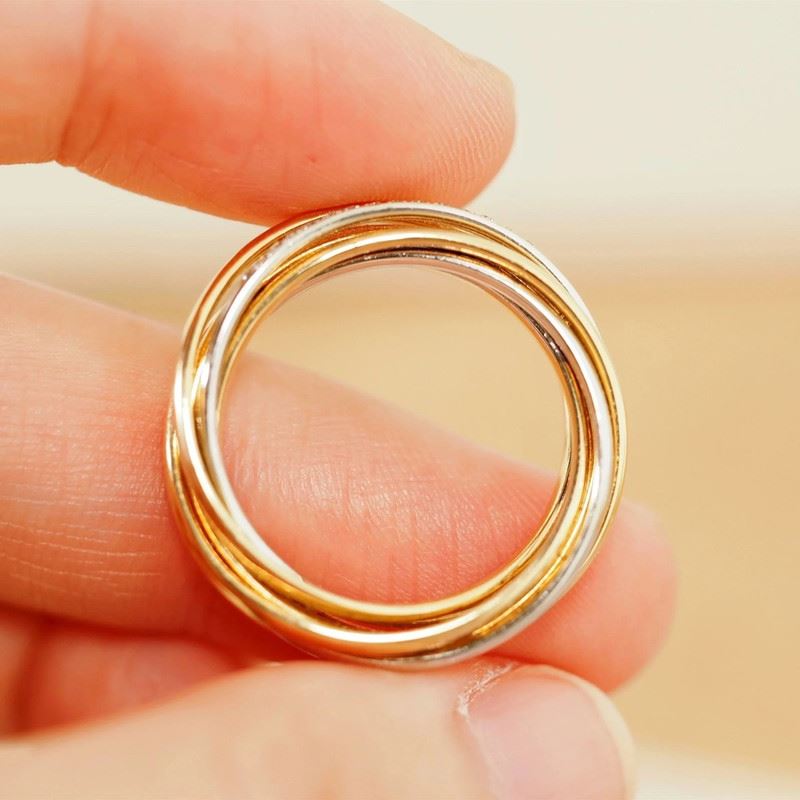 This 18K gold diamond triple band ring features an interlocking design with delicate diamonds set on the central band, adding luxury and sparkle to the piece. The combination of gold and silver bands creates a minimalist yet distinctive aesthetic, blending classic and modern styles. Perfect for both daily wear and special occasions, it’s an elegant statement piece.Ring size: 5.5, circumference: 51 mm, diameter: 16.2 mm, total weight: 7.35g.Note: GUILD certificate, comes with a jewelry, gemstone, and precious metal authentication certificate.