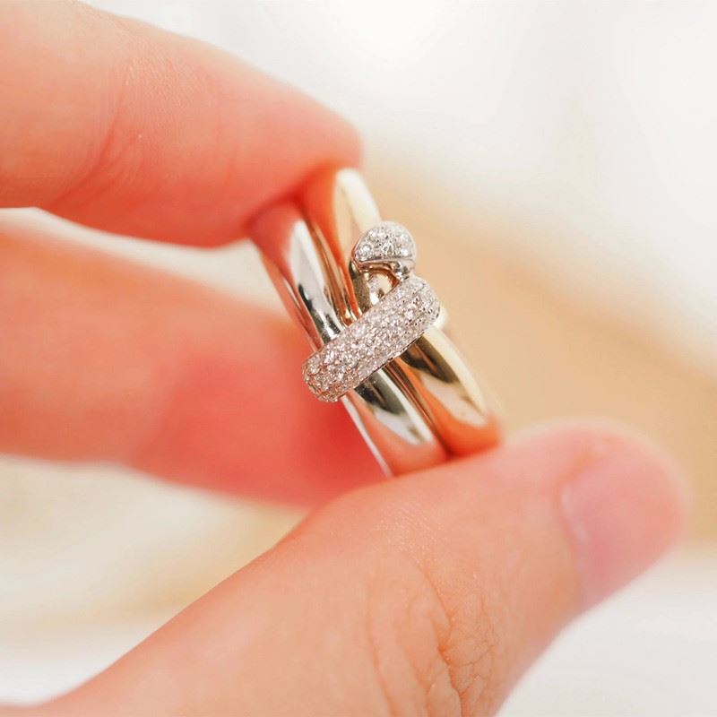 This 18K gold two-tone diamond ring combines rose gold and white gold, creating a unique and stylish design. The center of the ring is adorned with sparkling diamonds, offering a luxurious and refined look. The clever combination of two-tone metals makes the ring both modern and classic, making it perfect for various occasions. A piece full of individuality and elegance.Ring size: 6, circumference: 52 mm, diameter: 16.6 mm, total weight: 6.67g.Note: GUILD certificate, comes with a jewelry, gemstone, and precious metal authentication certificate.