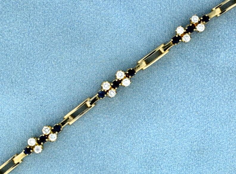 In 18k Yellow Gold. Contains twelve .05ct very high quality diamonds (.6 ct TW), VVS clarity/F color. Also contains nine 2mm high quality sapphires with deep blue color and excellent clarity. 7 3/4" long with a safety clasp. 15.6g