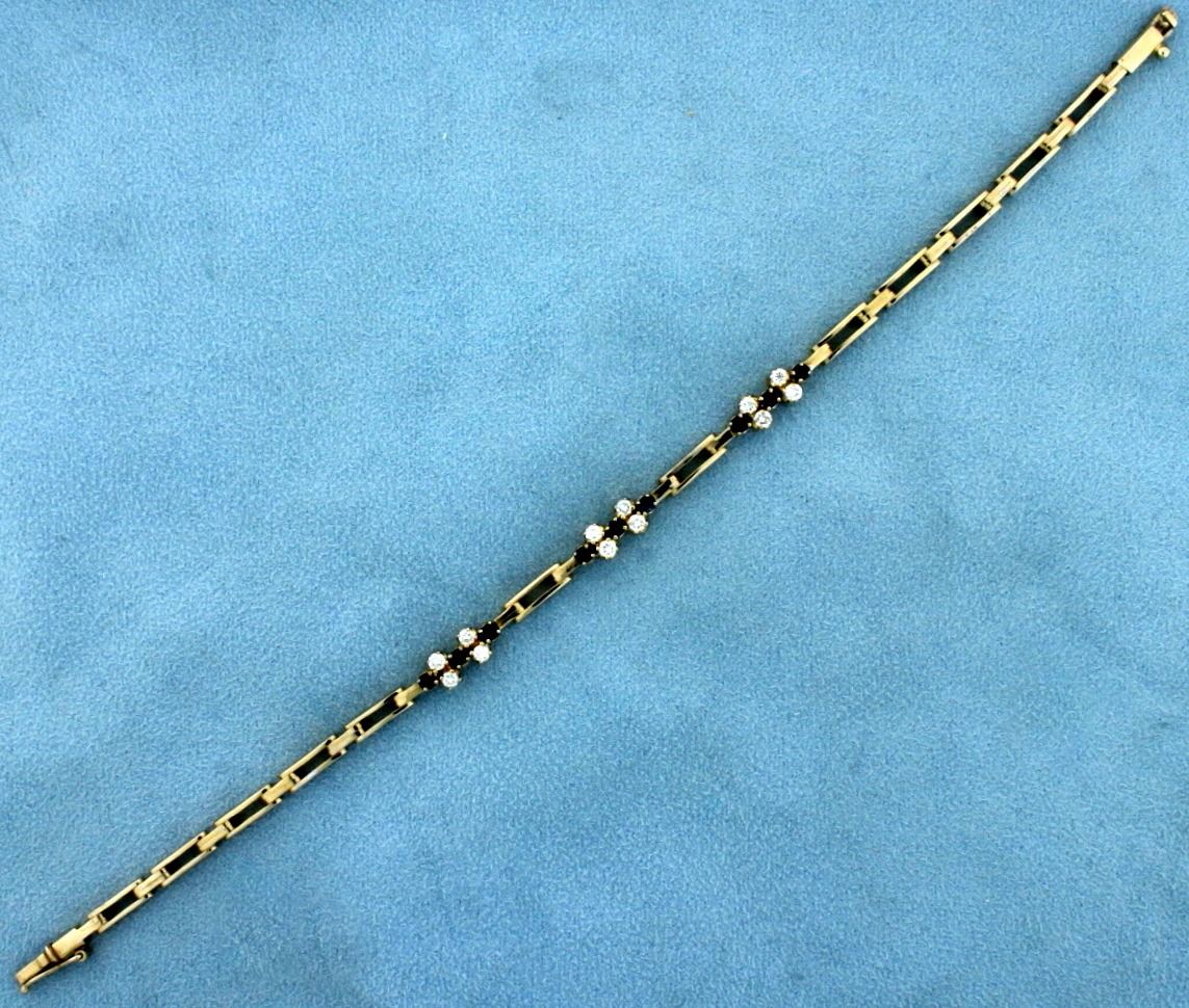 In 18k Yellow Gold. Contains twelve .05ct very high quality diamonds (.6 ct TW), VVS clarity/F color. Also contains nine 2mm high quality sapphires with deep blue color and excellent clarity. 7 3/4" long with a safety clasp. 15.6g