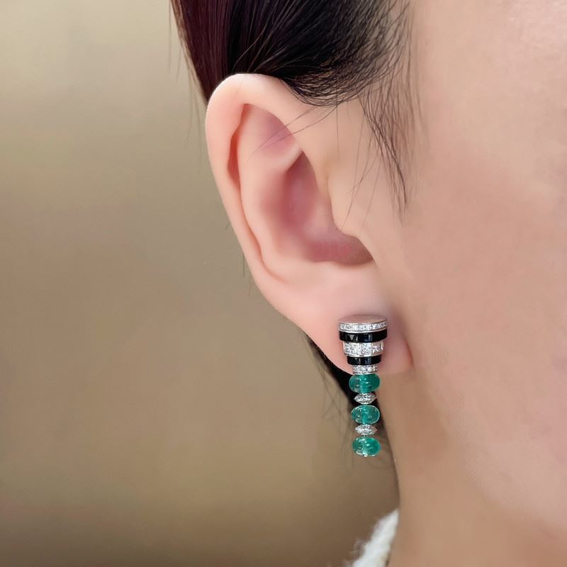 These 18K gold earrings feature a modern design with a combination of black onyx and diamonds at the top, while vibrant emerald beads hang below. The rich green of the emeralds contrasts elegantly with the black and diamond accents, creating a sophisticated and luxurious look.Total weight: 7.43g.Note: GUILD certificate, comes with a jewelry, gemstone, and precious metal authentication certificate.