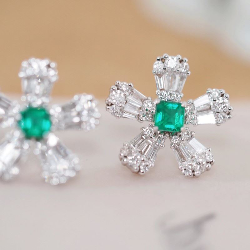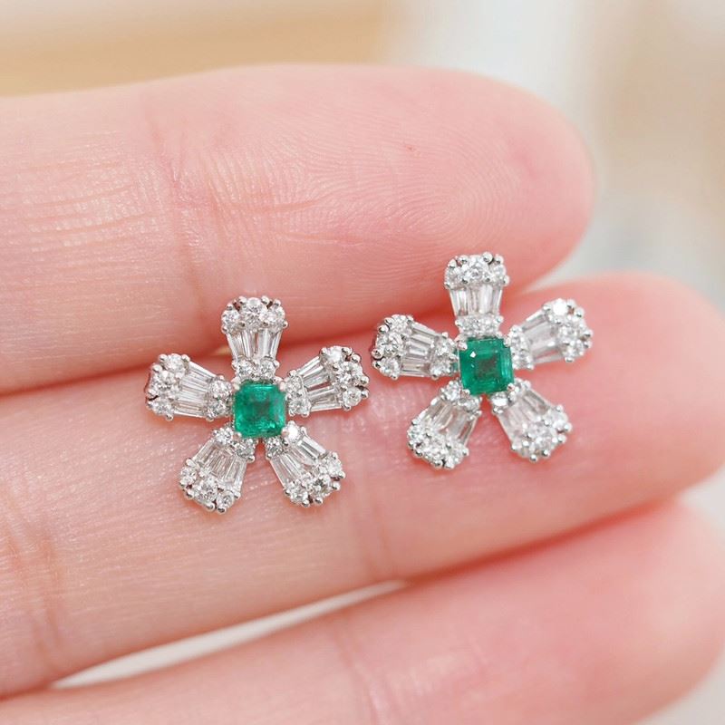 These 18K gold emerald earrings feature an exquisite floral design with the central emerald resembling the heart of a flower, surrounded by dazzling diamonds like blooming petals. The design blends modern simplicity with classic elegance, with the sparkling diamonds complementing the deep green of the emerald, adding a touch of refinement and nobility to the wearer.Total weight: 1.97g.Note: GUILD certificate, comes with a jewelry, gemstone, and precious metal authentication certificate.