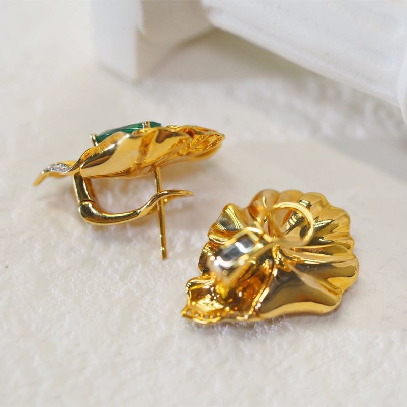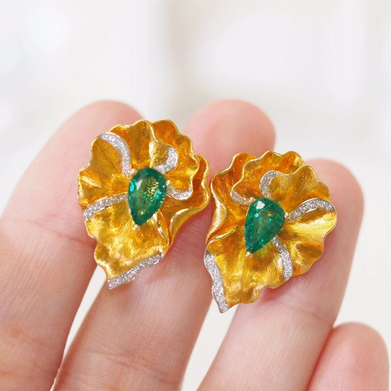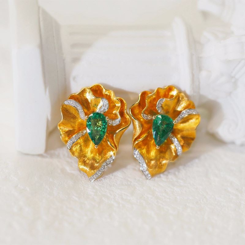 These 18K gold emerald lotus earrings are inspired by the graceful lotus in nature, with unique gold carving that complements the emerald gemstones. Each emerald cut perfectly showcases its pure color, set within the gold lotus shape, and accented with exquisite diamonds, blending luxurious style with a natural softness.Total weight: 10.61g.Note: GUILD certificate, comes with a jewelry, gemstone, and precious metal authentication certificate.
