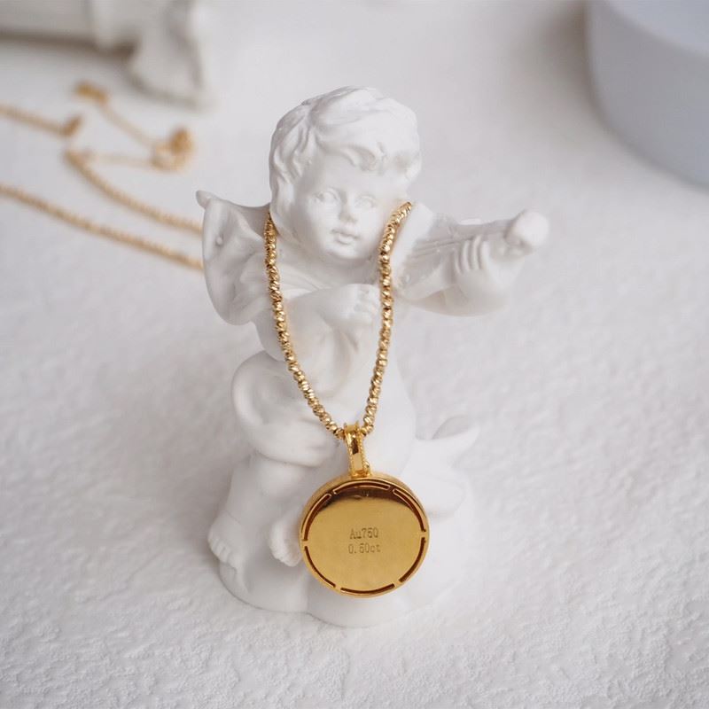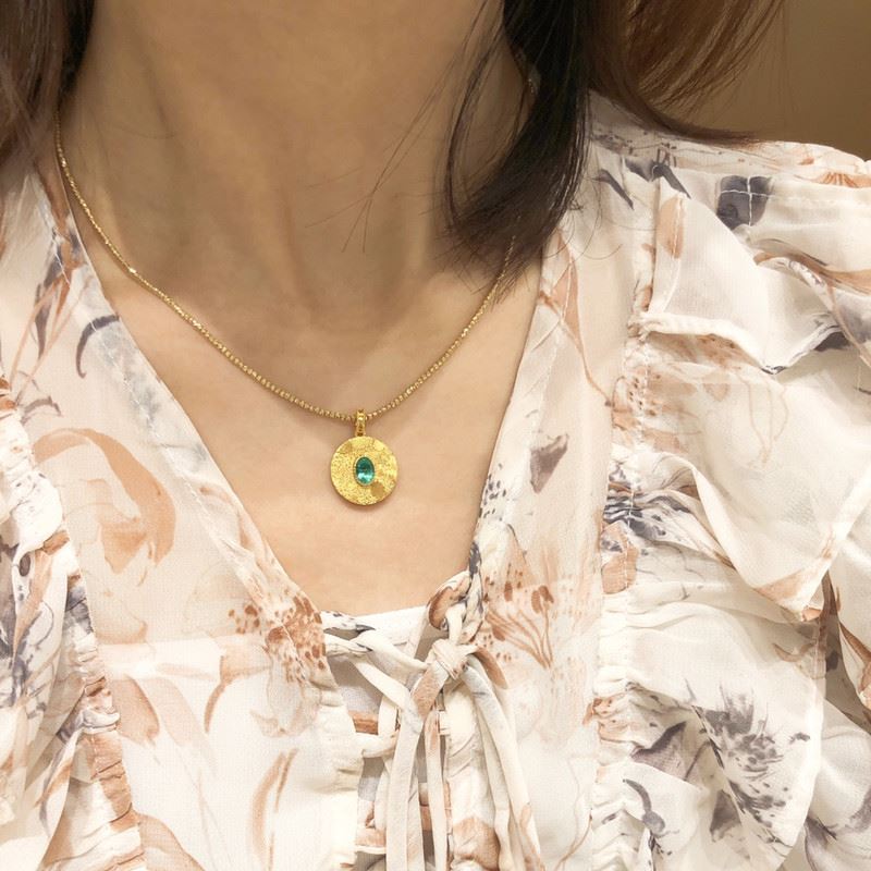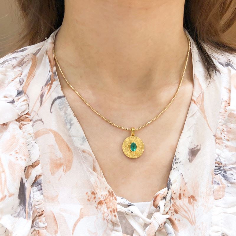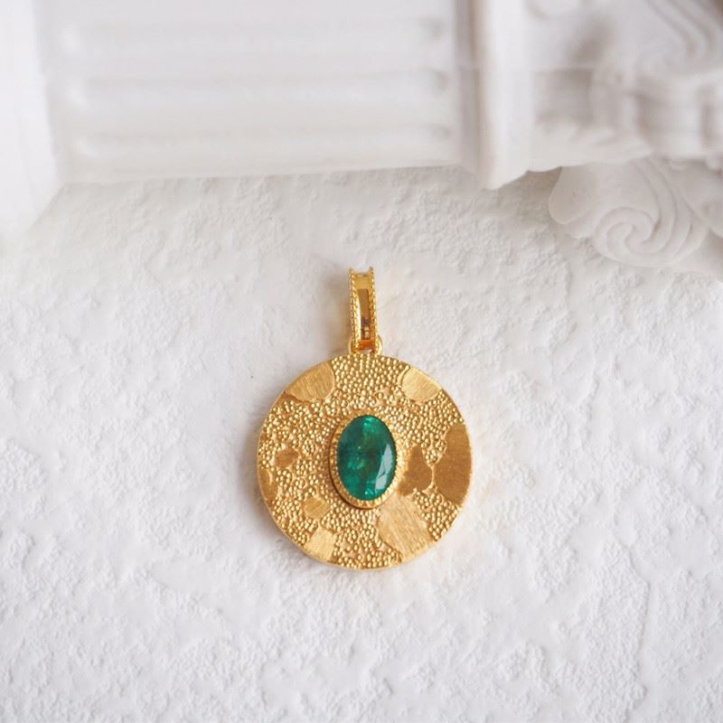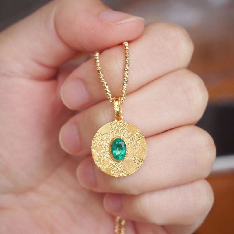 This 18K gold pendant features a circular medallion design centered with an oval emerald. The finely textured gold surface enhances its artisanal charm, while the vivid green gemstone shines brilliantly against the warm golden glow, embodying harmony between nature and elegance.Total weight: 4.39g.Note: GUILD certificate, comes with a jewelry, gemstone, and precious metal authentication certificate.