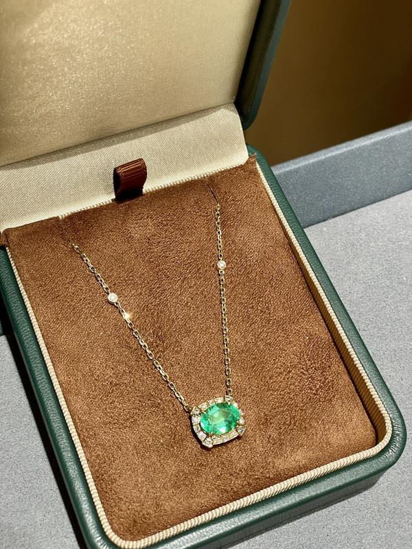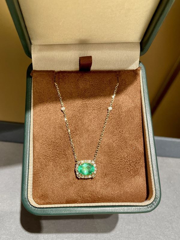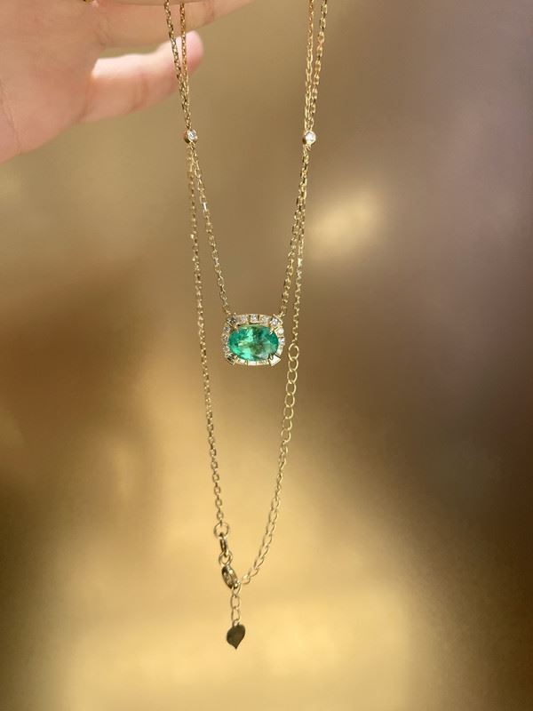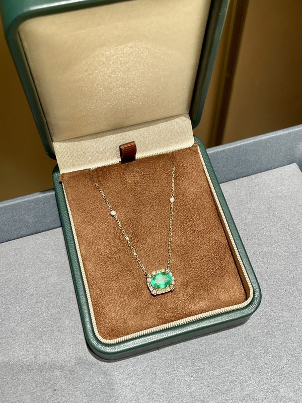 This 18K gold emerald necklace features an exquisite gold chain paired with a stunning emerald gemstone, offering a simple yet sophisticated design. The central emerald is surrounded by diamonds, sparkling brilliantly and adding a touch of luxury and style. Whether paired with everyday attire or as a statement piece for special occasions, this necklace radiates elegance and taste.Total weight: 4.7g.Note: GUILD certificate, comes with a jewelry, gemstone, and precious metal authentication certificate.