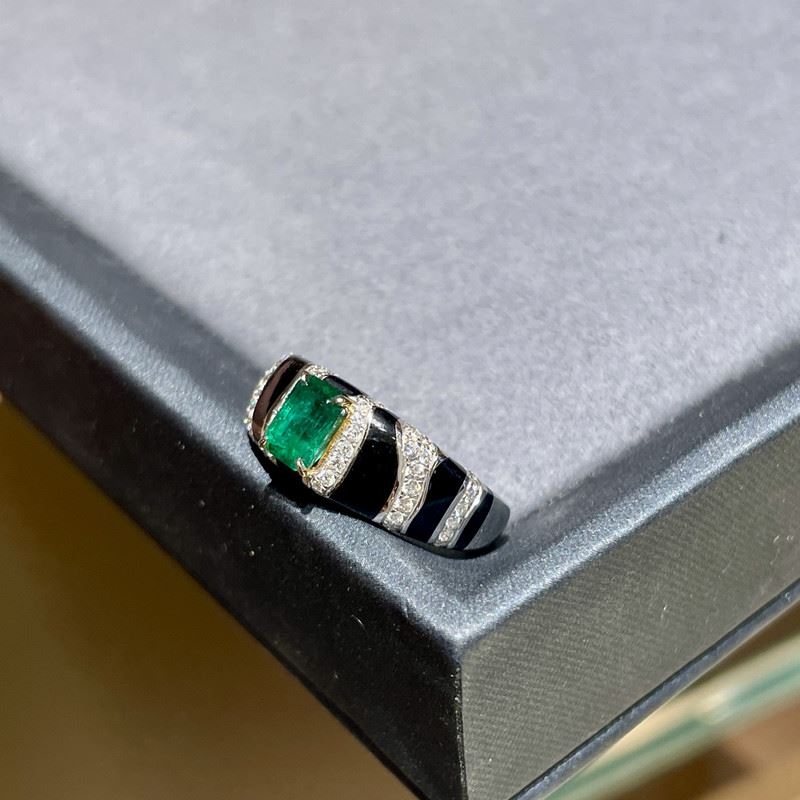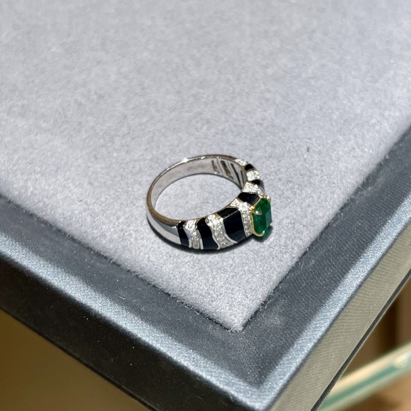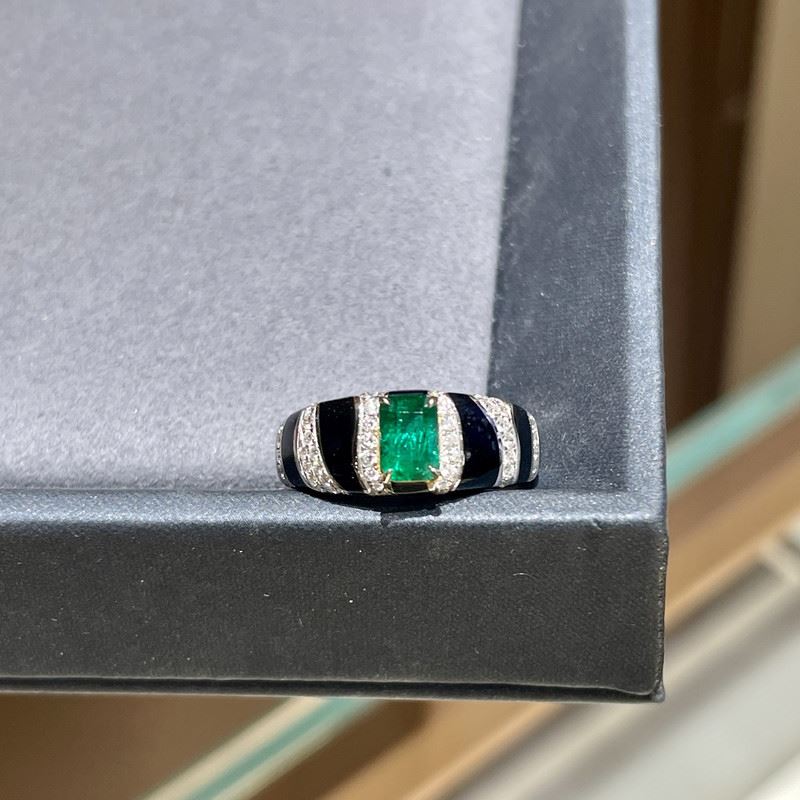 This 18K gold ring features a square-cut emerald centerpiece accented with black enamel and diamonds. The vivid green contrasts beautifully with the deep enamel tones, creating a modern yet elegant aesthetic.Ring size: 6, circumference: 52 mm, diameter: 16.6 mm, total weight: 5.33g.Note: GUILD certificate, comes with a jewelry, gemstone, and precious metal authentication certificate.