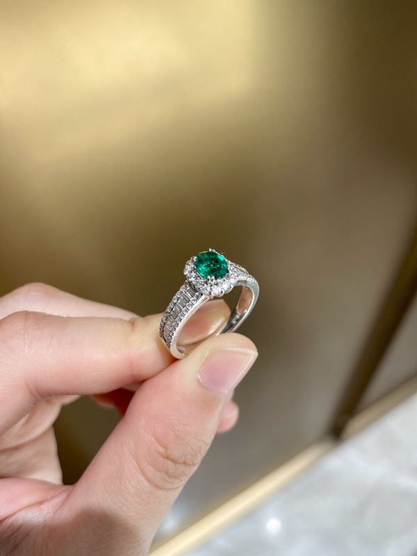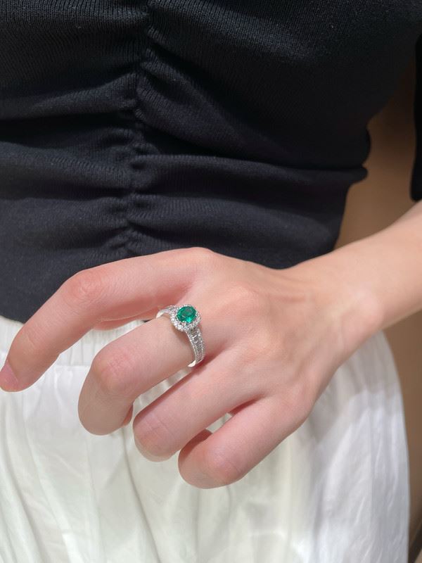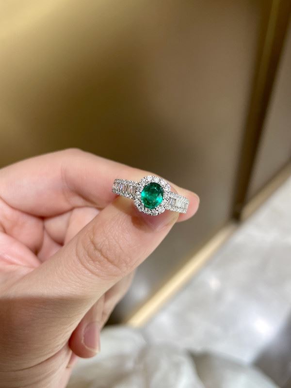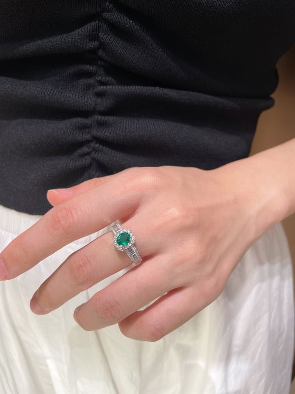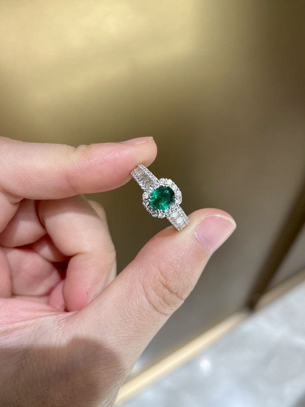 This 18K gold ring features a brilliant emerald at its center, surrounded by sparkling diamonds. The finely crafted band, with delicate carvings, complements the brilliance of the gemstones, creating an elegant and luxurious design that exudes sophistication and style.Ring size: 6.5, circumference: 53 mm, diameter: 17 mm, total weight: 4.78g.Note: GUILD certificate, comes with a jewelry, gemstone, and precious metal authentication certificate.