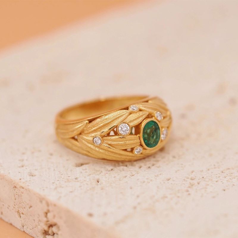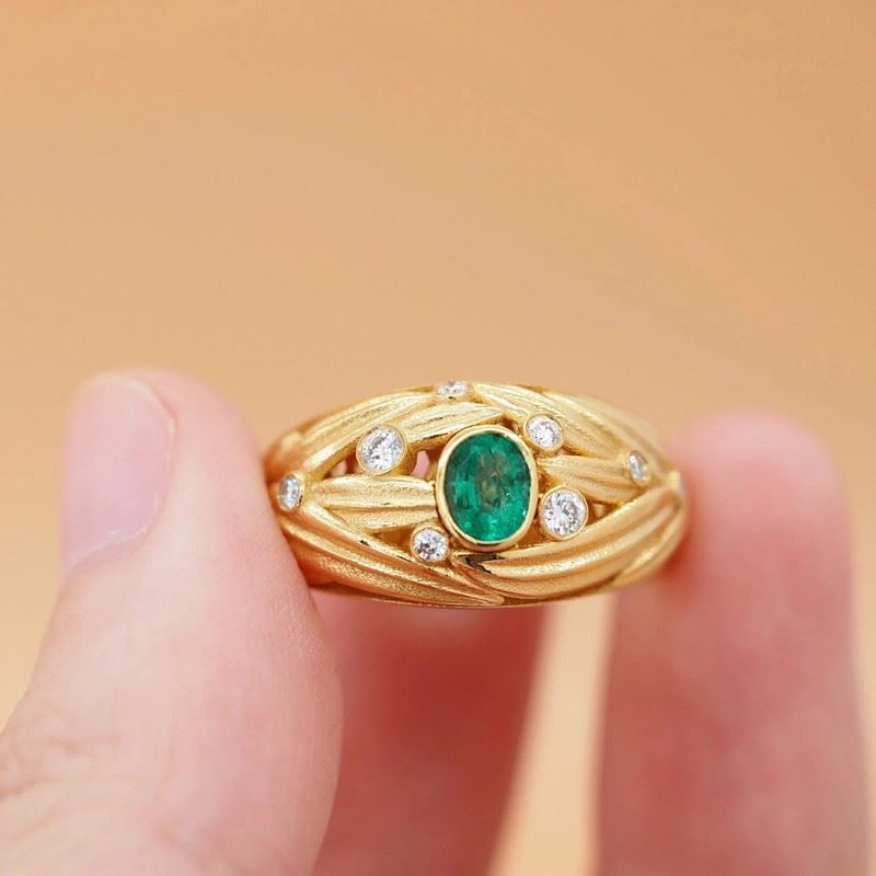 This 18K gold emerald ring features a delicate woven design with a vibrant emerald at its center, surrounded by sparkling diamonds, blending elegance and luxury. The textured gold band complements the gemstones, highlighting the ring’s exquisite and noble charm. Ideal for formal occasions, it is a unique addition to any jewelry collection.Ring size: 6, circumference: 52 mm, diameter: 16.6 mm, total weight: 7.39g.Note: GUILD certificate, comes with a jewelry, gemstone, and precious metal authentication certificate.