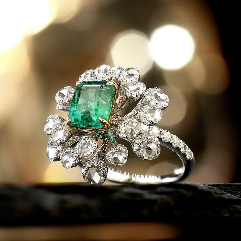 This stunning 18K gold ring features a brilliant emerald at its center, with a deep and vibrant hue, surrounded by a cluster of sparkling diamonds resembling a blooming flower. The exquisite design exudes nobility and luxury, making it perfect for any special occasion.Ring size: 6, circumference: 52 mm, diameter: 16.6 mm, total weight: 6.02g.Note: GUILD certificate, comes with a jewelry, gemstone, and precious metal authentication certificate.