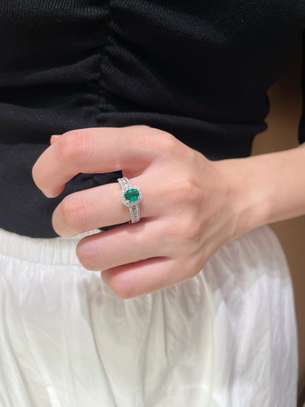 This 18K gold ring features a brilliant emerald at its center, surrounded by sparkling diamonds. The finely crafted band, with delicate carvings, complements the brilliance of the gemstones, creating an elegant and luxurious design that exudes sophistication and style.Ring size: 6.5, circumference: 53 mm, diameter: 17 mm, total weight: 4.78g.Note: GUILD certificate, comes with a jewelry, gemstone, and precious metal authentication certificate.