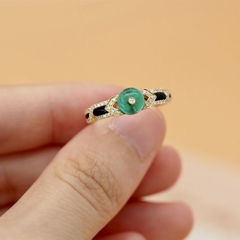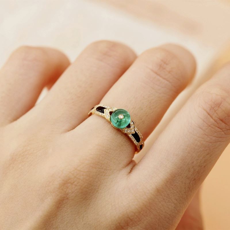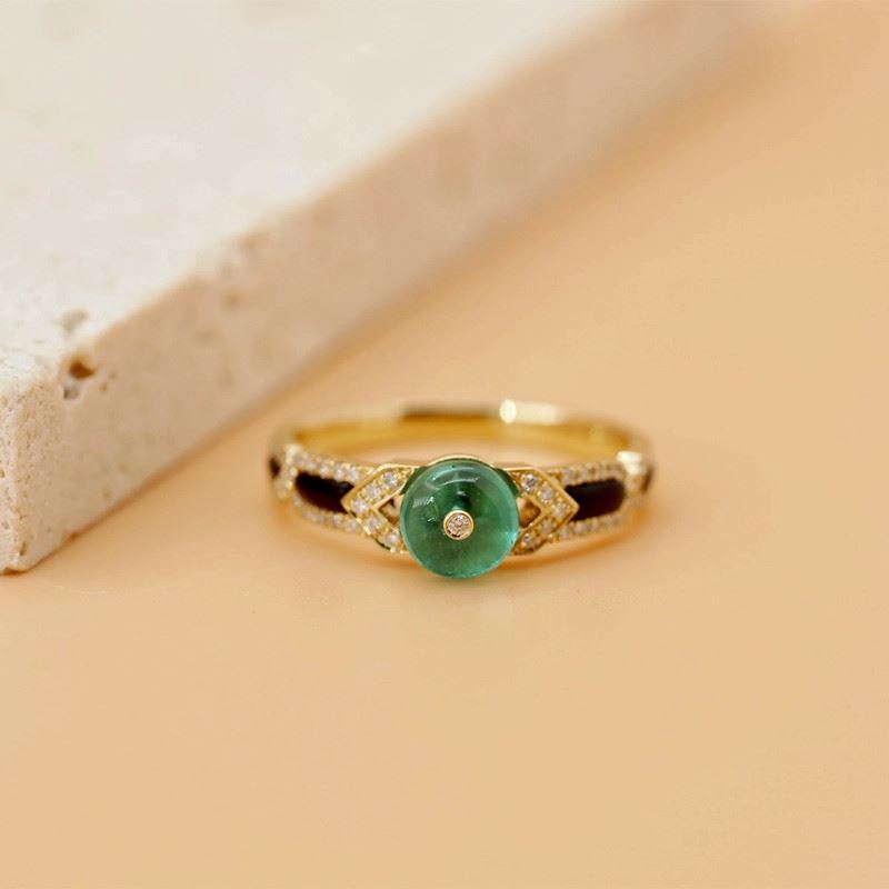 This 18K gold emerald ring features a dazzling emerald at the center, surrounded by exquisite diamonds and black gemstones, offering an elegant and sophisticated design. The deep green of the emerald contrasts beautifully with the golden metal, while the diamonds add a touch of luxury. Its unique design makes it the perfect choice for both daily wear and special occasions.Ring size: 6, circumference: 52 mm, diameter: 16.6 mm, total weight: 2.6g.Note: GUILD certificate, comes with a jewelry, gemstone, and precious metal authentication certificate.