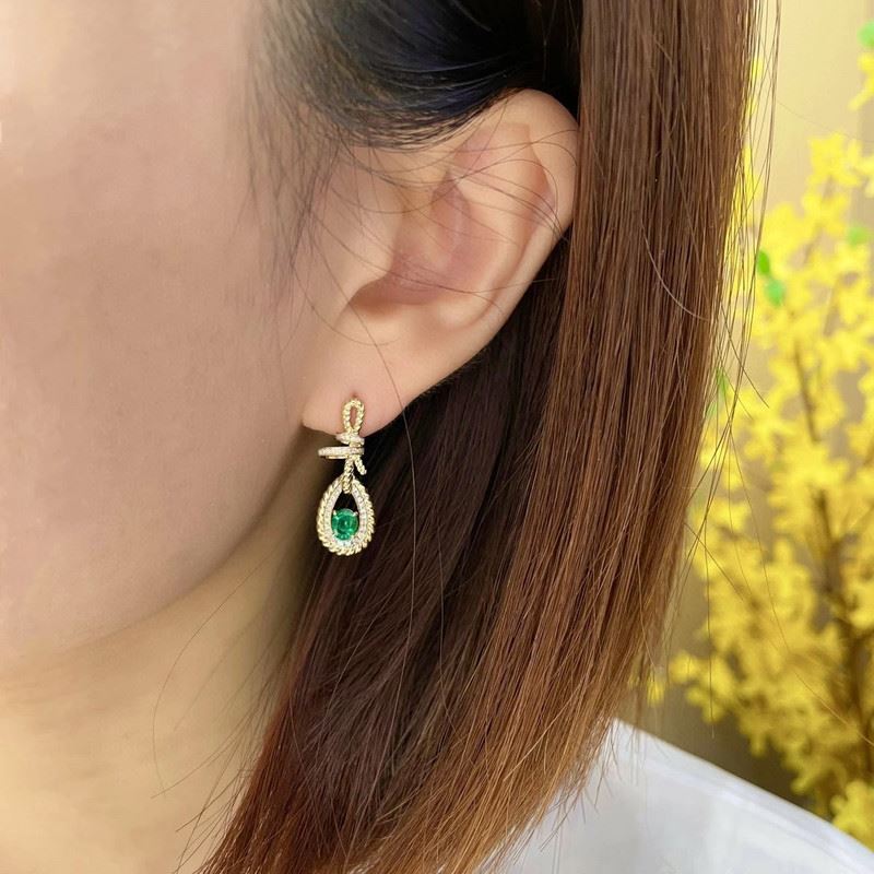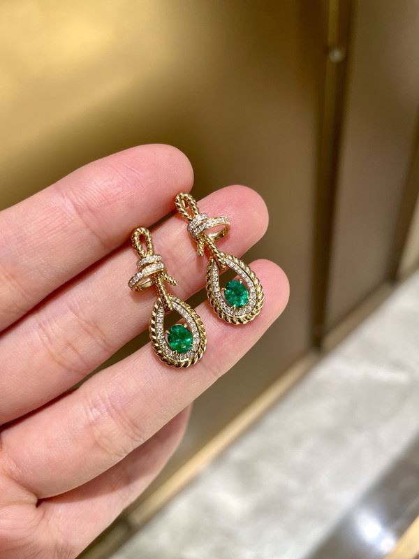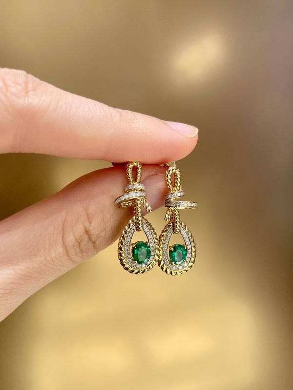 These 18K gold earrings feature teardrop-shaped emeralds at the center, surrounded by sparkling diamonds and delicate gold woven detailing. The vibrant green of the emerald complements the brilliance of the diamonds, creating an elegant and refined look.Total weight: 5.13g.Note: GUILD certificate, comes with a jewelry, gemstone, and precious metal authentication certificate.
