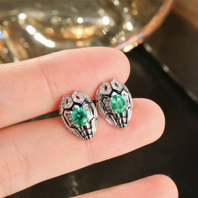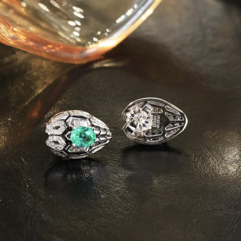 These 18K gold stud earrings feature vibrant emeralds at the center, surrounded by delicate diamonds and a uniquely sculpted gold frame. The emerald’s lush green hue and the sparkle of diamonds create an elegant fusion of luxury and sophistication.Total weight: 5.33g.Note: GUILD certificate, comes with a jewelry, gemstone, and precious metal authentication certificate.