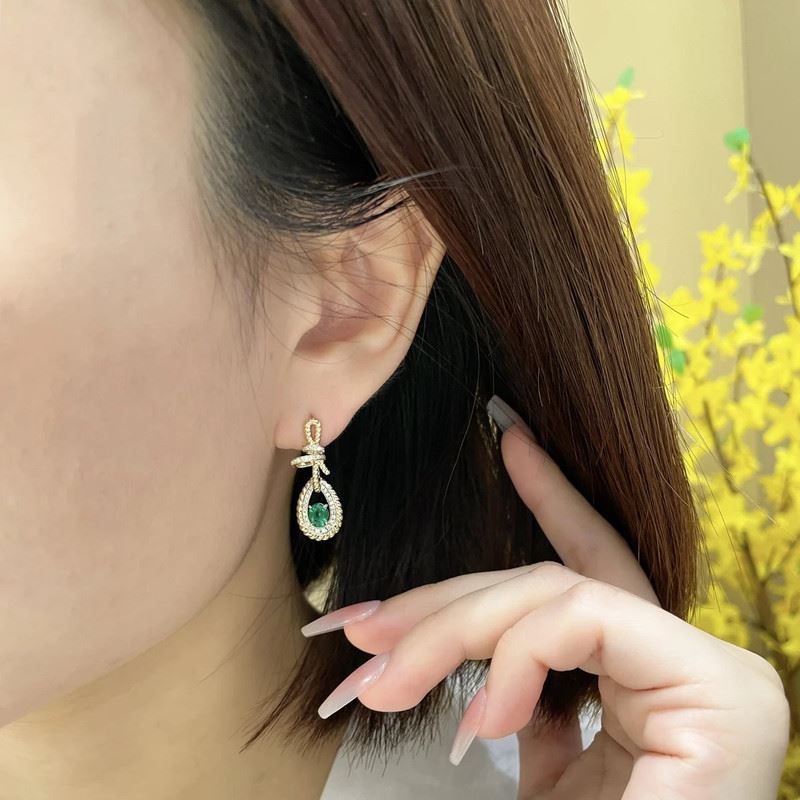 These 18K gold earrings feature teardrop-shaped emeralds at the center, surrounded by sparkling diamonds, with intricate braided gold detailing that adds dimension and elegance. The vivid green of the emerald and the brilliance of the diamonds create a luxurious and sophisticated look.Total weight: 5.33 g.