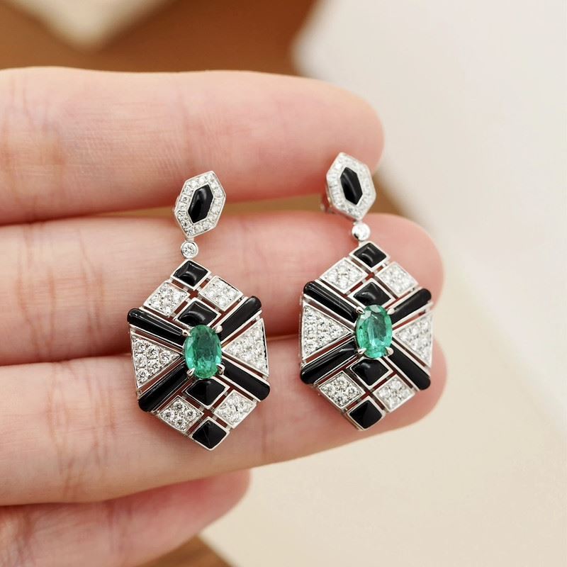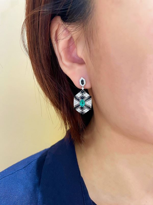 These 18K gold earrings feature a geometric design with vibrant emeralds at the center, accented by diamonds and black onyx. The fresh green of the emeralds contrasts beautifully with the sparkle of the diamonds, exuding an elegant and luxurious vibe.Total weight: 9.35g.Note: GUILD certificate, comes with a jewelry, gemstone, and precious metal authentication certificate.