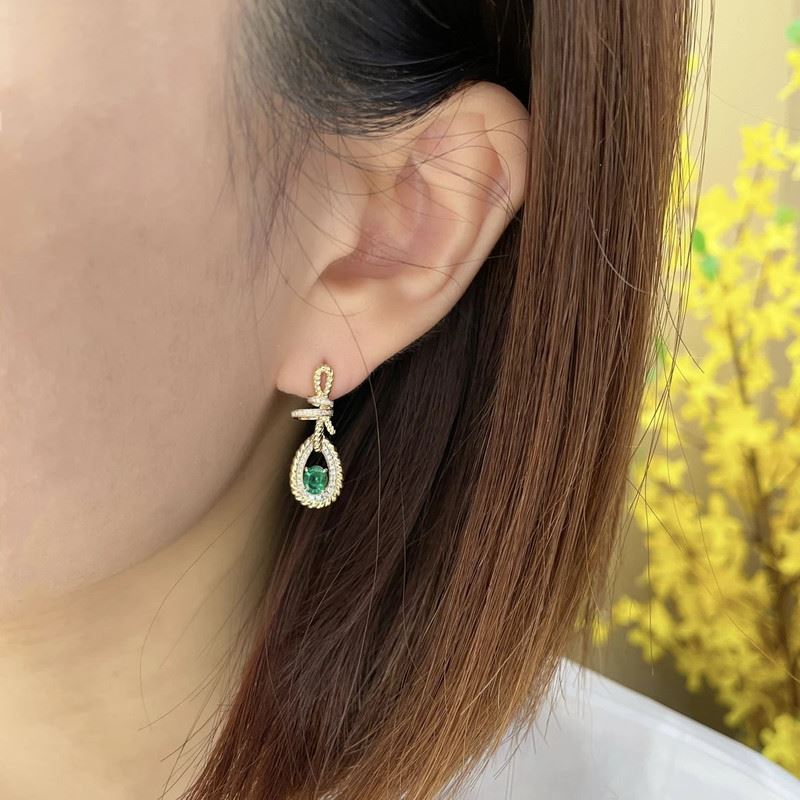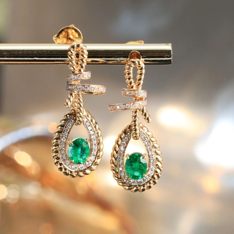 These 18K gold earrings feature teardrop-shaped emeralds at the center, surrounded by sparkling diamonds, with intricate braided gold detailing that adds dimension and elegance. The vivid green of the emerald and the brilliance of the diamonds create a luxurious and sophisticated look.Total weight: 5.33g.Note: GUILD certificate, comes with a jewelry, gemstone, and precious metal authentication certificate.