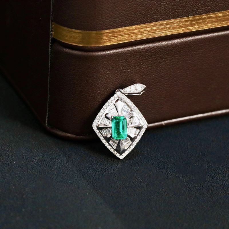 This 18K gold pendant features a rectangular emerald at its center, surrounded by radiating baguette and round-cut diamonds. The layered design sparkles with brilliance, exuding an aura of luxury and refined elegance.Total weight: 3.82g.Note: GUILD certificate, comes with a jewelry, gemstone, and precious metal authentication certificate.