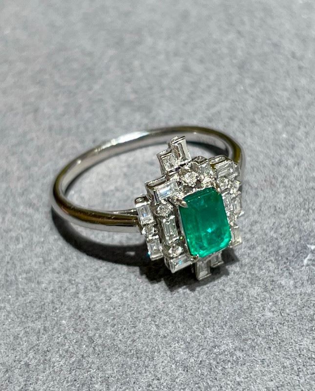 This 18K gold ring features a rectangular emerald surrounded by finely cut diamonds in a tiered arrangement. The design exudes refined elegance, blending vintage charm with contemporary sophistication.Ring size: 6, circumference: 52mm, diameter: 16.2mm, total weight: 3.48g.
