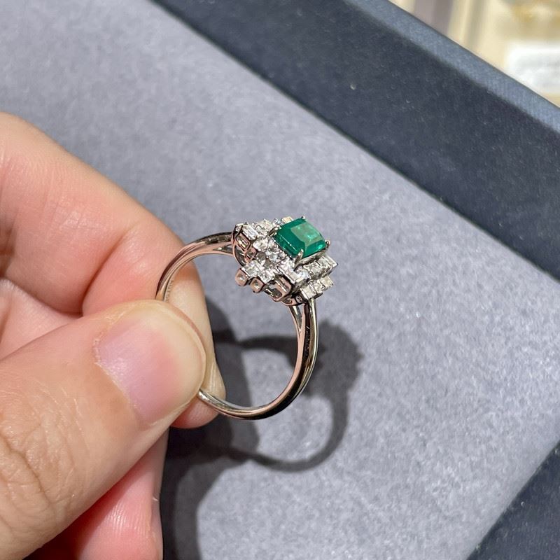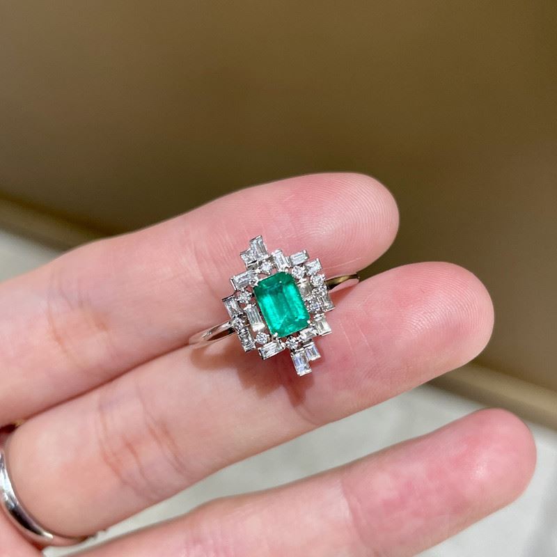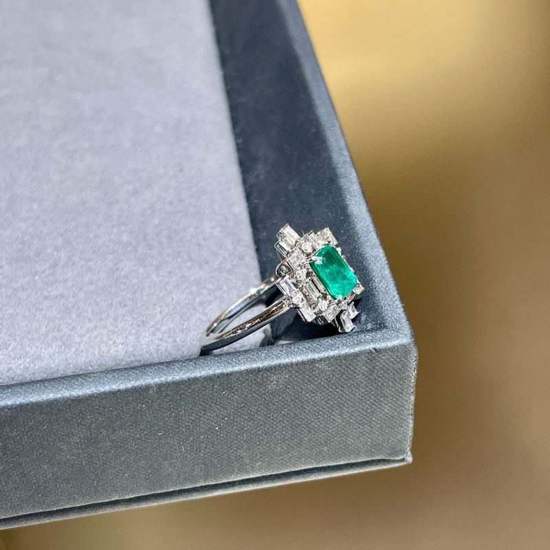 This 18K gold ring features a rectangular emerald surrounded by finely cut diamonds in a tiered arrangement. The design exudes refined elegance, blending vintage charm with contemporary sophistication.Ring size: 6, circumference: 52 mm, diameter: 16.6 mm, total weight: 3.48g.Note: GUILD certificate, comes with a jewelry, gemstone, and precious metal authentication certificate.