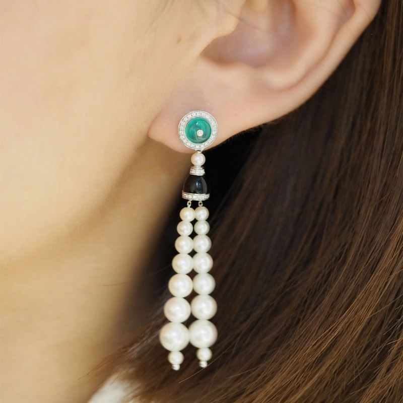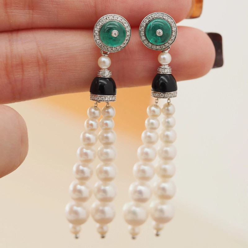 These 18K gold earrings combine emeralds, pearls, and black onyx in a clever design. The tassel design adds a dynamic and elegant touch, with the luster of the pearls beautifully complementing the rich green color of the emeralds, exuding unique artistic charm and luxury.Total weight: 9.51g.Note: GUILD certificate, comes with a jewelry, gemstone, and precious metal authentication certificate.