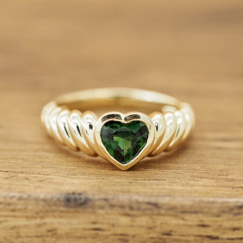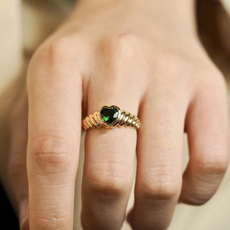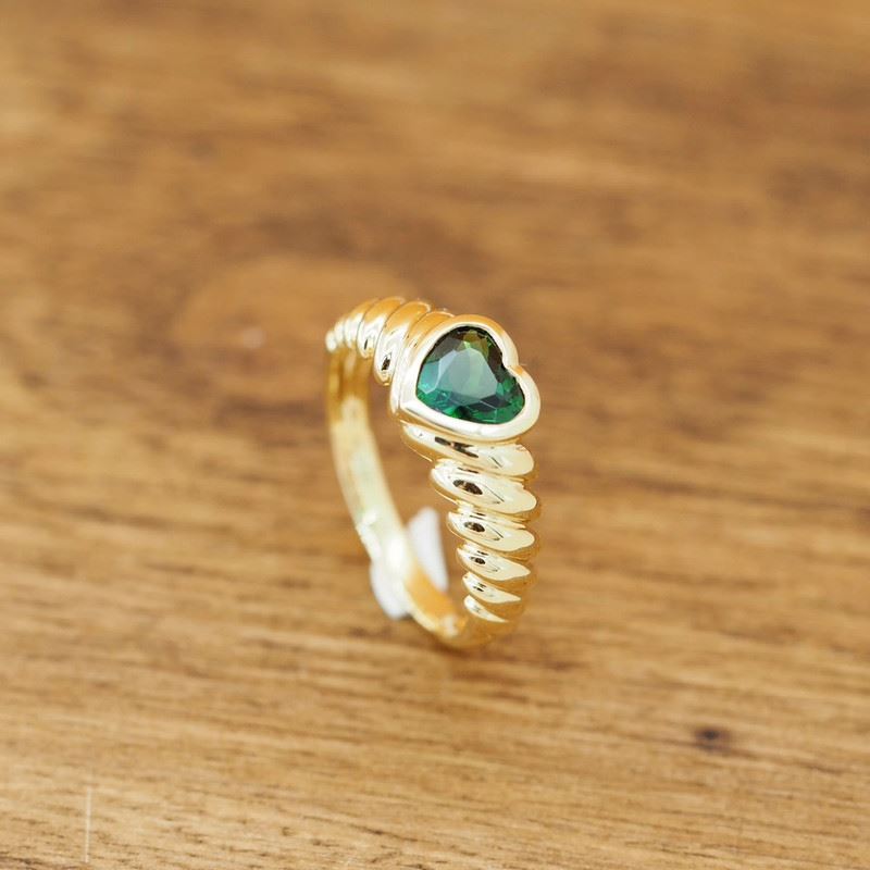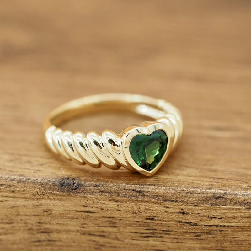 This 18K gold Fanta stone ring features a heart-shaped green gemstone at the center, surrounded by a spiral-textured band that adds a dynamic and modern touch. The deep green of the gemstone contrasts beautifully with the golden metal, highlighting the ring’s nobility and unique charm. Ideal for both daily wear and special occasions, it perfectly complements the wearer’s elegant style.Ring size: 6, circumference: 52 mm, diameter: 16.6 mm, total weight: 4.41g.Note: GUILD certificate, comes with a jewelry, gemstone, and precious metal authentication certificate.