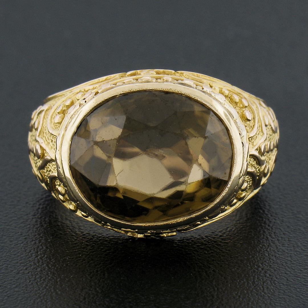 A solid 18k yellow gold ring, with 1 GIA fraded oval cut natural zircon. The ring is size 4.0, weighs a total of 8.76 grams, and measures 12.6mm wide. Comes with all original relevant certifications.