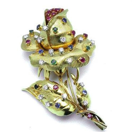 18K gold brooch designed like a rose and bejeweled with rubies, sapphires, emeralds and diamonds. Circa 1960